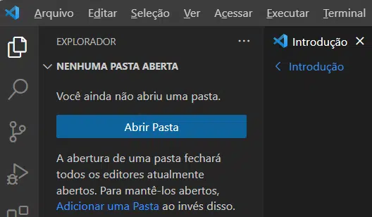 Após instalado, abra seu VS Code e crie uma nova pasta onde será salvo o seu documento HTML.