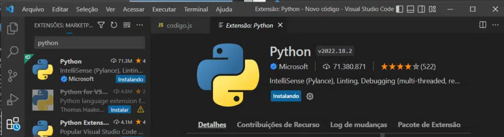 Agora se quiser adicionar uma extenção é simples, basta pressionar (Ctrl + Shift + X) que